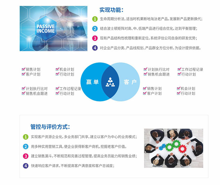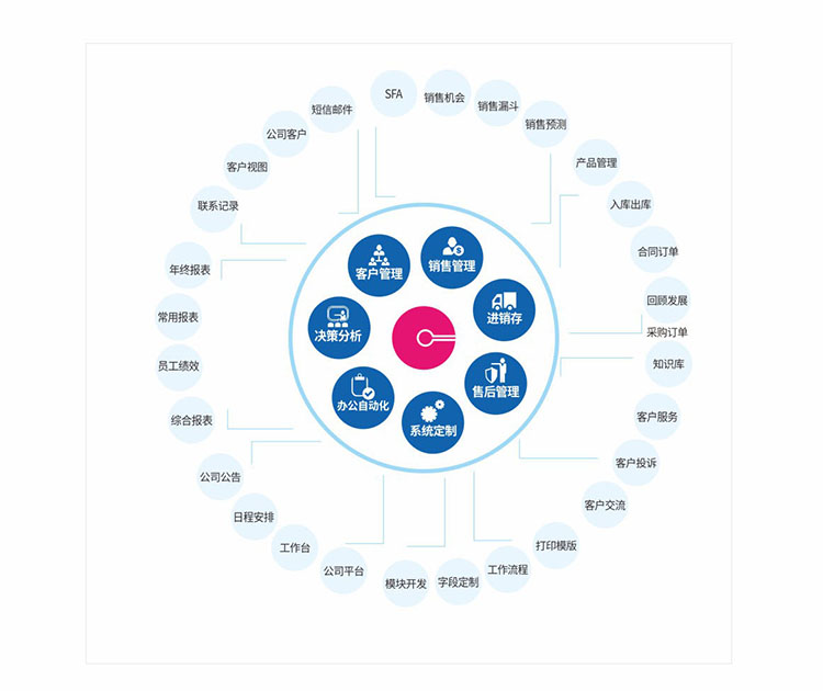 系統特色:實現360度全面了解客戶,通過客戶視圖不僅可以了解客戶的基本信息、聯系信息,了解客戶的業務往來信息,對銷售機會進行精確分析,甄別有價值客戶,從而加強跟單過程控制,提升簽約率。另外銷售跟進與操作評價,有助于銷售團隊的能力提升和潛能挖掘。