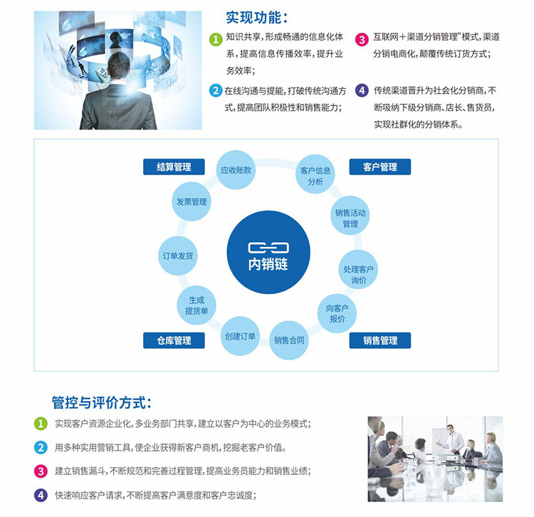 系統(tǒng)特色:實現(xiàn)360度全面了解客戶,通過客戶視圖不僅可以了解客戶的基本信息、聯(lián)系信息,了解客戶的業(yè)務(wù)往來信息,對銷售機(jī)會進(jìn)行精確分析,甄別有價值客戶,從而加強跟單過程控制,提升簽約率。另外銷售跟進(jìn)與操作評價,有助于銷售團(tuán)隊的能力提升和潛能挖掘。