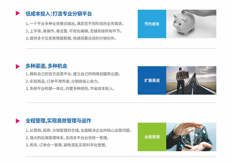 國內(nèi)營銷戰(zhàn)略涵蓋:分銷渠道管理、級別限制、促銷與返利、虛擬庫存、訂單管理(審核、驗貨、發(fā)貨、退換貨)、吞吐量分析、帳務(wù)管理、流水管理、對帳管理等。